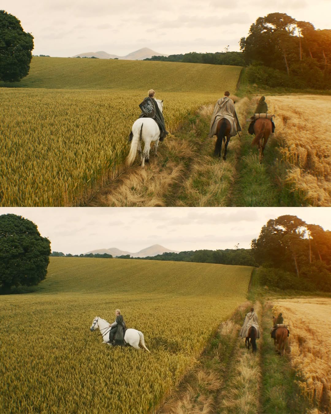 The final shot of the show’s first season is Dunk riding into the distance with his mentee, Egg. Arlan can be seen riding behind them, as a sort of ghost. He is indeed long dead. Dunk has resisted taking on Egg as a squire because he doesn’t yet believe he is Ser Duncan the Tall, but in saying Yes to Egg, it became a little more real.