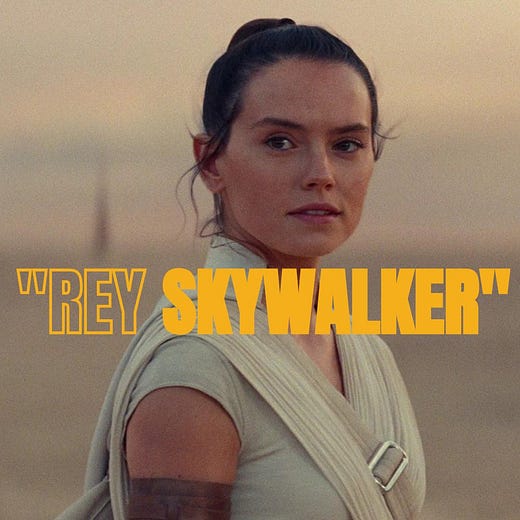 To which she responds, “I’m Rey…..Rey Skywalker.”